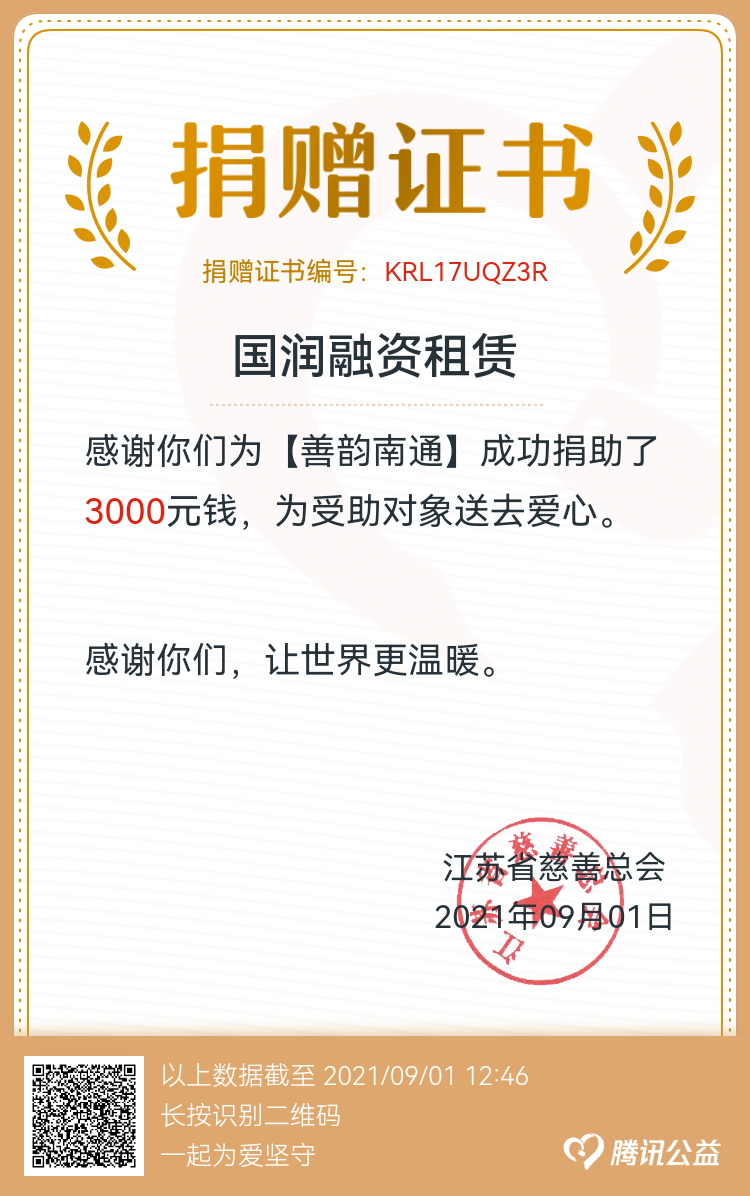 為大力弘揚中華民族扶貧濟困的優(yōu)良傳統(tǒng),發(fā)揮慈善在脫貧攻堅中的積極作用,按照市民政局等單位《2021年“博愛在南通 慈善暖江?!币蝗站杌顒臃桨浮返耐ㄖ?,國潤租賃組織全體員工于9月1日開展了線上一日捐活動。